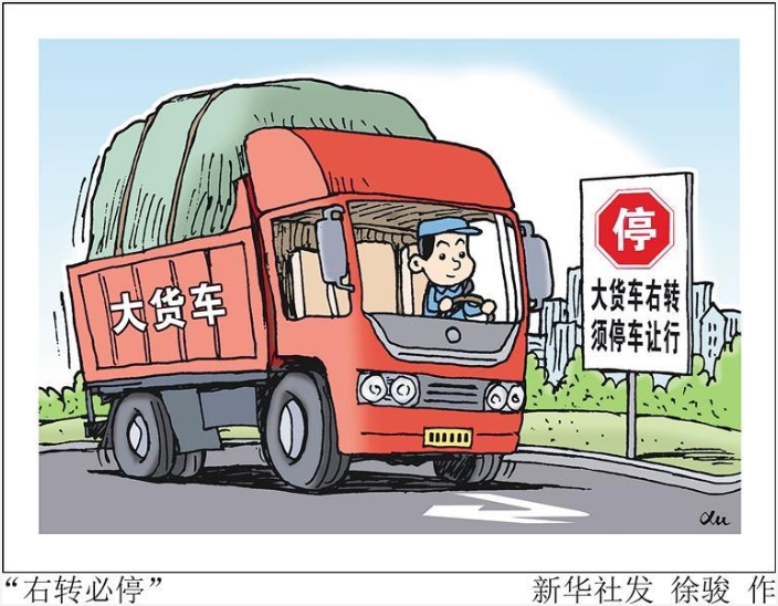 大型车辆在路口右转时要严格按照“一停、二看、三起步、四缓行通过”四个步骤进行右转弯,但在不同的路口又有不同的操作步骤。