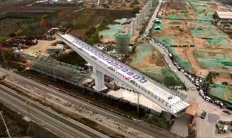 至16时许,转体桥成功“转身”73.2度,西安地铁10号线杏渭路站-水流路站高架区间上跨西安铁路枢纽北环线转体桥与南北两侧边跨墩成功合龙,在西安城市轨道交通建设史上尚属首次。