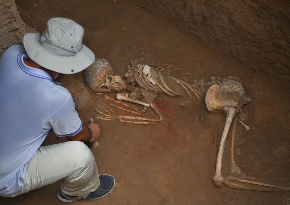 考古人员在石峁遗址皇城台发现的高等级墓地中进行发掘(2022年8月6日摄)。新华社记者张博文摄