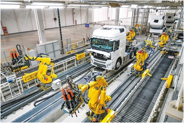 陕汽重卡扩能项目总装生产线,工业机器人正在进行自动化装配作业。(资料照片)记者窦翊明摄