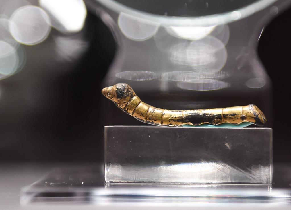 这条“鎏金铜蚕”1984年出土于陕西石泉县,首尾共计9个腹节,制作精致,造型逼真。新华社记者罗晓光摄