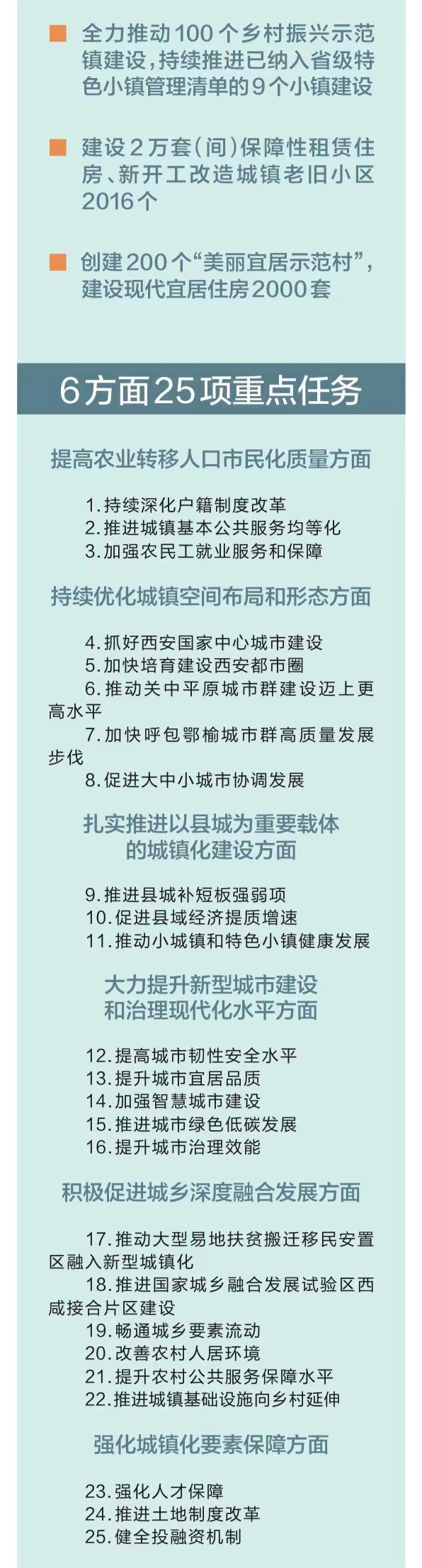 陕西明确责任部门,重点实施3项任务:推进县城补短板强弱项,在全省范围内选择一批基础优、潜力大、积极性高的县(市),开展省级以县城为重要载体的城镇化建设试点示范,指导富平县、三原县、岐山县开展全国县城新型城镇化建设试点示范;促进县域经济提质增速,研究制定2023年度重点清单,完善资金政策举措,统筹抓好城镇平台、产业平台、创新平台、投融资平台建设,统筹抓好特色经济、联农带农经济、集体经济、民营经济发展,统筹抓好基础设施体系、商贸物流体系、公共服务体系、社会治理体系构建;推动小城镇和特色小镇健康发展,全力推动100个乡村振兴示范镇建设,持续推进已纳入省级特色小镇管理清单的9个小镇建设,开展第二批纳入全省特色小镇管理清单申报评审工作,组织召开特色小镇现场观摩会,总结推广好经验好做法。