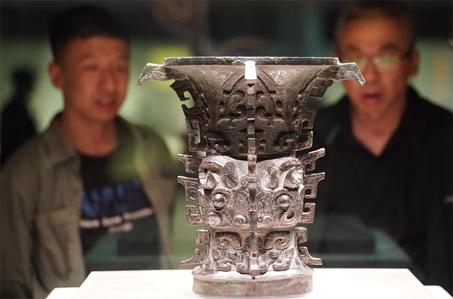游客在宝鸡青铜器博物院参观文物何尊。新华社记者 邵瑞 摄