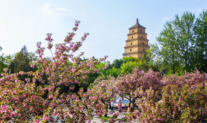 游客在西安大雁塔下游览(无人机照片,2024年4月10日摄)。新华社记者 邹竞一 摄