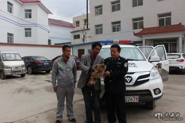 4月15日9时许,兰州市森林公安局西固派出所接到金沟乡政府工作人员电话,称金沟乡小金沟村一热心村民捡拾到一只受伤无法飞行疑似猫头鹰的鸟类动物,要求救助。为使受伤的野生动物及时得到救治,该所民警立即联系并委托协作单位关山派出所就近出警救助,关山森林派出所民警迅速赶到现场,所长张国成对热心村民王某的关爱野生动物、在国家野生保护动物需要救助的时候及时伸出援手并向政府有关单位报告的行为给予充分的肯定和高度赞扬。