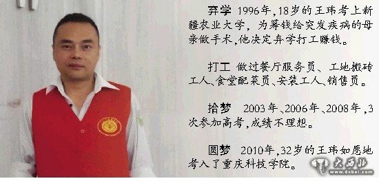 2008年王玮又考了一次,成绩只有300多分,2009年他放下工作,安心复习了半年。“有人嘲笑我,不理解我, 认为我早过了上学的年龄,工作成家才是要紧,可我不管。”经过努力,2010年他如愿地考入了重庆科技学院,32岁的他终于成为了一名大学生。