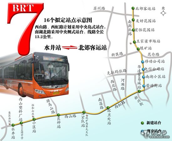 其中,西山路、西虹路一段7处站点将采用中央专用道+中央岛式站台(只设置一个站台双向换乘),其余9处采取中央专用道+中央侧式站台(设置一对站台)。在16个站点中,12处为新建,南湖南路的4个站利用现状站点,可直接免费换乘BRT3号线。