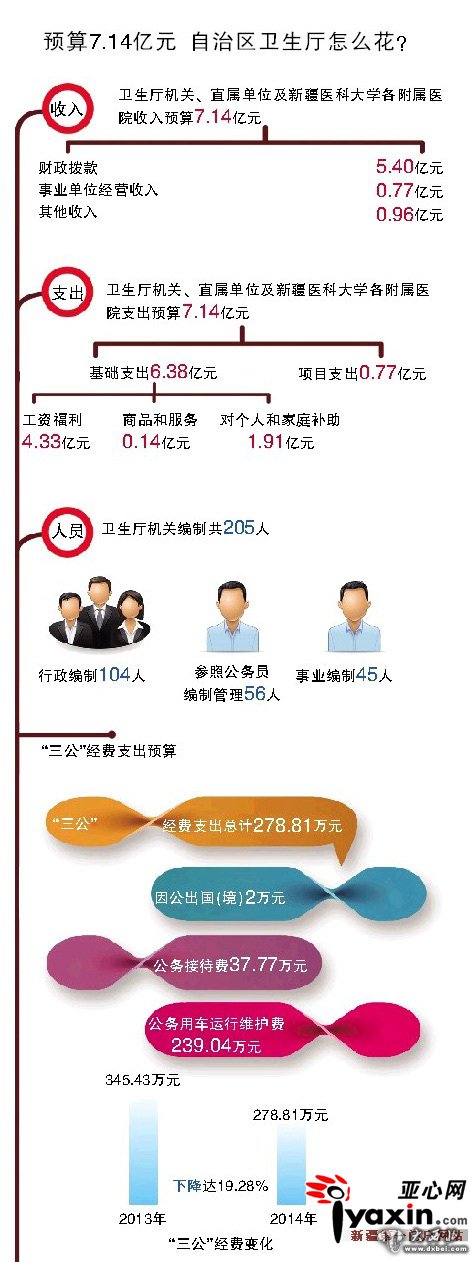 卫生厅2014年部门预算最高,卫生厅机关、直属单位及新疆医科大学各附属医院预算7.14亿元,也是目前公布预算部门中惟一一家预算上亿的。相比去年,我区公布部门预算上亿元的单位有10余家,包括自治区税务局、水利厅、卫生厅、公安厅、文化厅等,而当年卫生厅机关及直属单位以预算6.32亿元排在各亿元大户的前列。