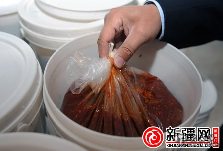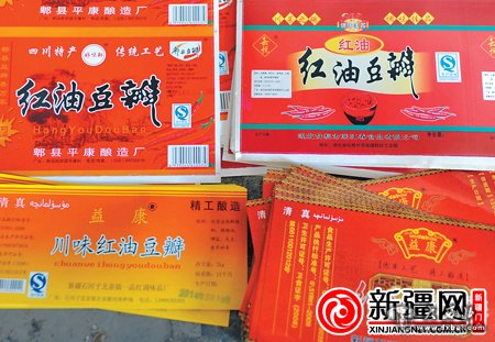 从随处堆放的外包装即时贴看,其中包括湖北、四川郫县等地的四个品牌豆瓣酱,而包装桶却是“新疆制造”。