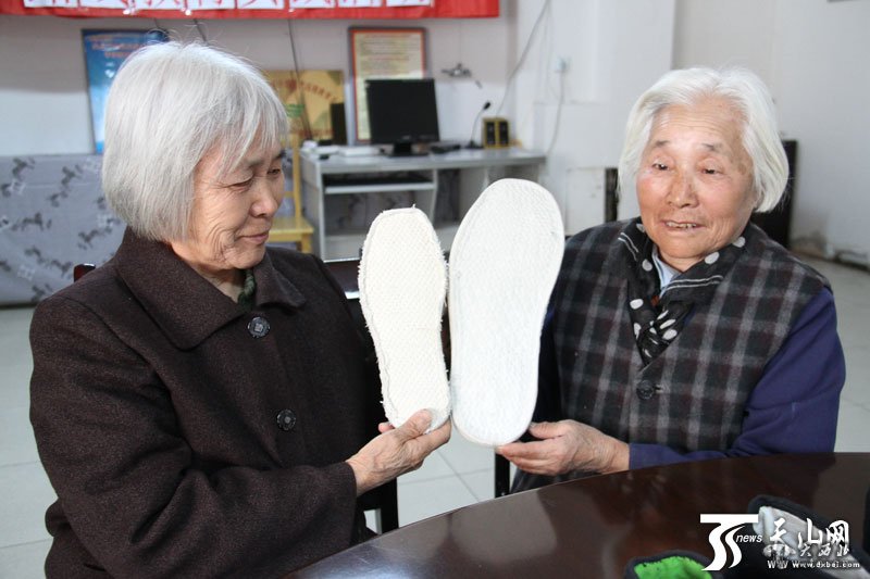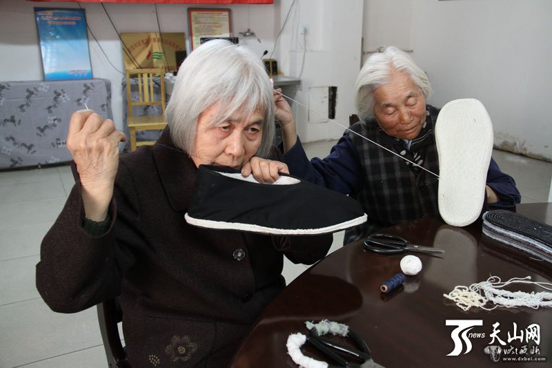 68岁的何秀甫和78岁的李淑花都是“五七工”,以前就靠制作婴儿布鞋在路边摆摊卖挣些生活费。前两年自治区解决了“五七工”的养老金问题,老人有了生活保障,做布鞋的活计自然就少了。两位老太太听到社区找人做特大号鞋给1500公里远的和田维吾尔族农民解决生活困境后立即报名。她们用了10天时间,赶制了两双“千层底”布鞋和六双鞋垫。