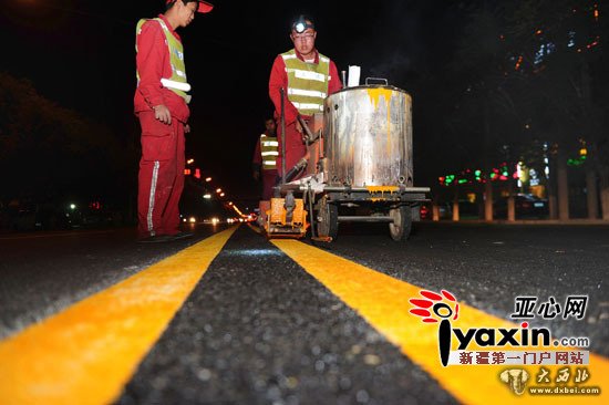 5月7日0时,乌市阿勒泰路上,乌市公安局交警支队在道路中间进行画双实线。亚心网记者 马元 摄