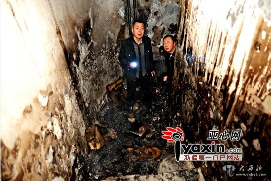 图为两名工作人员到着火现场查看。亚心网记者 张万德 摄