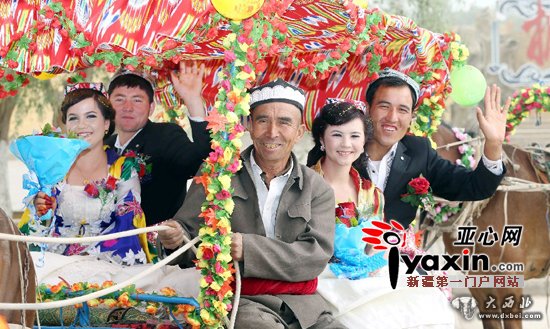 当天9时,在手鼓声和麦西来甫歌舞队引领下,载满新人的马车、电瓶车从有着“刀郎画乡”之称的库木库萨尔乡出发,缓缓向集体婚礼现场——刀郎文化广场驶来,道路两边围满了喊着“恭喜!恭喜!”的群众。