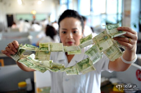 图为工作人员向记者展示半截的一元纸币用胶带拼接在一起,这样的工作每天都在进行。亚心网记者 李铁军 摄