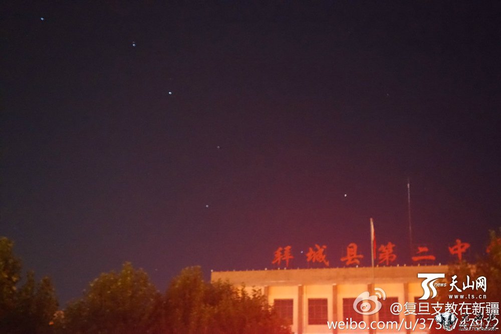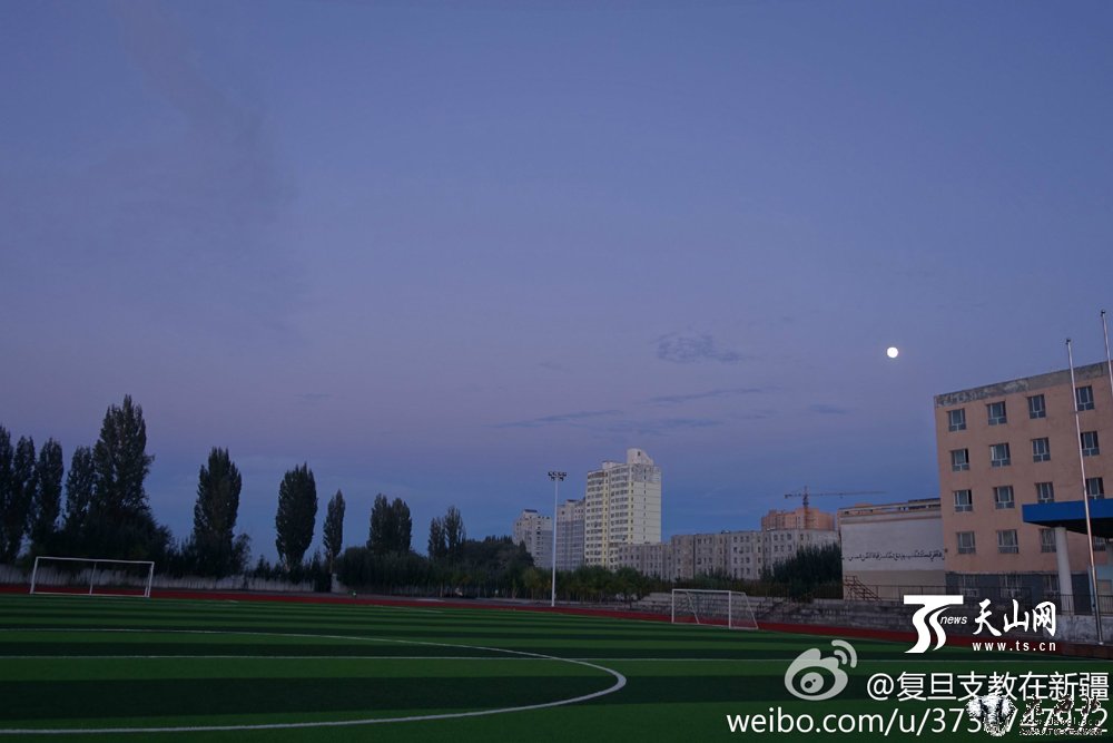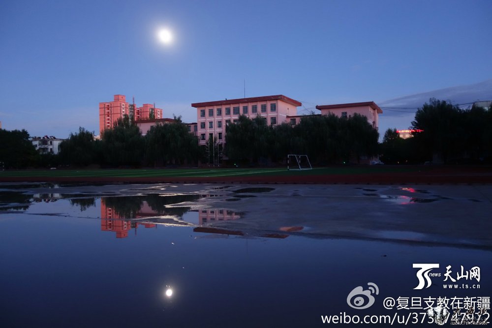 网友“复旦支教在新疆”:这是复旦研支团在新疆度过的第二个中秋。相比今晚,昨晚暴雨过后的夜空更加晴朗,校园里月色、倒影相映,北斗七星缀在教学楼顶、黑杨树梢。中秋夜,最初月亮躲藏在云层之后透着光亮,直到深夜才皓月当空,没有让我们留下赏月遗憾。