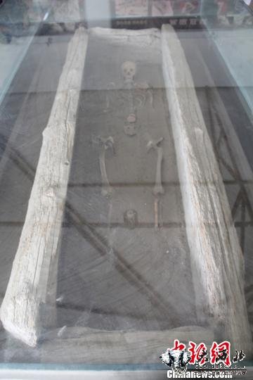 记者在史料馆里看到,有两个玻璃柜内分别置放着两具人体骨架,特别引人注目。其中一个从玻璃柜、棺木的长度一眼就可以断定骨架的长度不少于两米。另一个柜子里是一具女性干尸,依然可以看到稀疏的头发和布衣碎片。