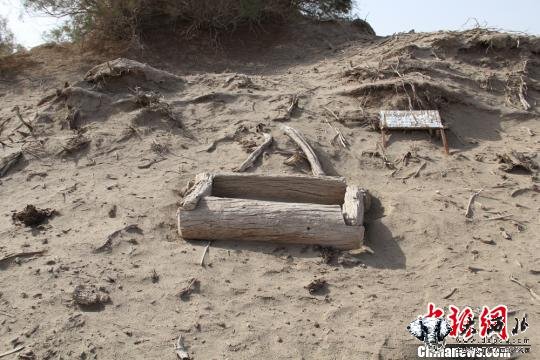 中新网记者近日走进该古墓群看到,古墓多数在沙丘顶部或者半坡上,有的被风吹得露出了棺木,有的一座沙丘上可以看见几组棺木,棺木大多由四块直径20到30厘米一劈为二的胡杨原木拼成。当地介绍称,出土的所有棺木皆无底座,且男女上下合葬,屈肢葬成为主导类型;出土尸骸头发全为金黄,颧骨高耸,面型偏长,身形高大,呈现欧罗巴人种的诸多特征。