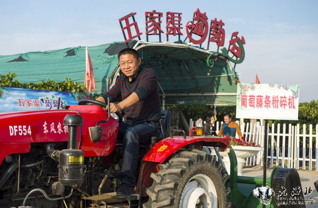新疆生产建设兵团农园果蔬有限公司总经理宁晋中坐在葡萄谷的拖拉机上