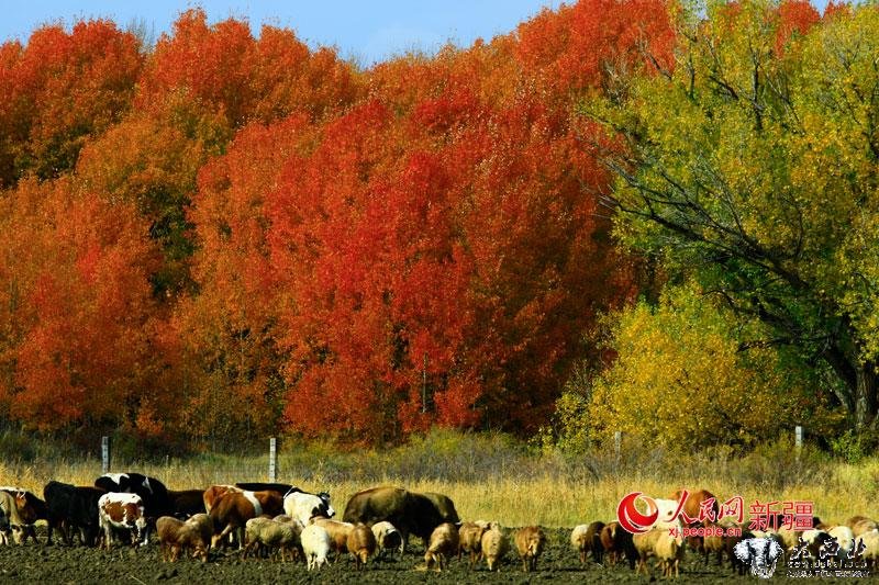 在新疆哈巴河县,沿着额尔齐斯河畔行走,会发现一处一处的美景。无论是动态还是静态的仿佛都是一气呵成,精致可巧,浑然天成。白天鹅、灰鸭在湖水中嬉戏,牛羊在收割后的庄稼地里觅草、游客在其间漫游,一片片心状的红叶正如一串串火苗,点燃了树木枝头,一簇簇,一团团,象火焰,如红云,染得满山遍野,红波相涌。伫立在这美景当中的,久久不忍离去。(通讯员张丽霞 白泉露)