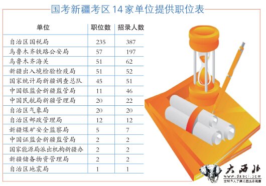 与去年相比,这次国考新疆提供职位的招录单位有所增加,提供职位和人数也有所增加,包括中国民用航空局新疆管理局、自治区国税局等14家单位514个职位,共计招录863人。