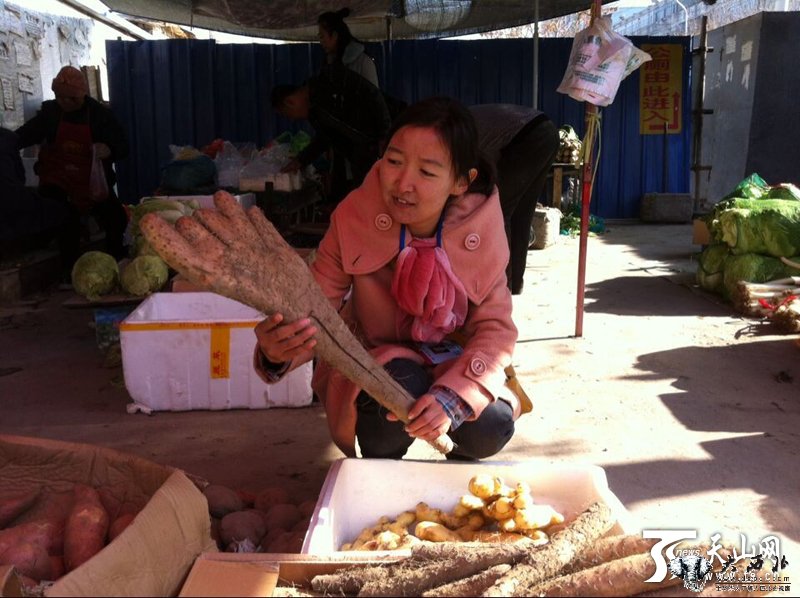 大西北网11月18日讯 11月14日,博湖县博湖镇菜市场庞女士菜摊的一根“佛手”山药引来众多群众观看。