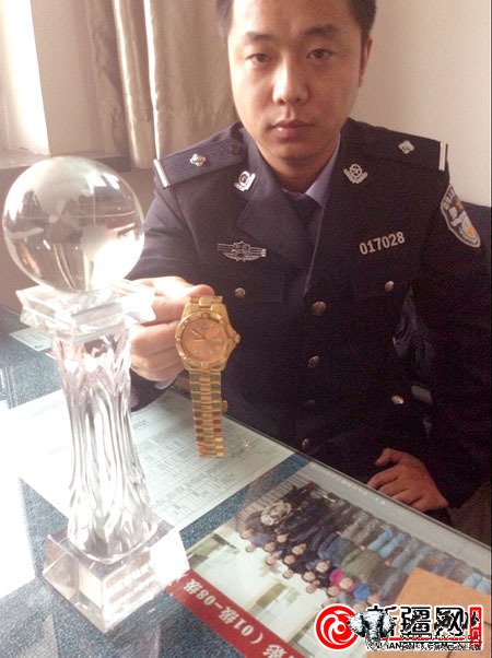 办案民警展示顾某给柴某送的“将军表”和柴某花了3000万元买的特殊贡献奖奖杯。
