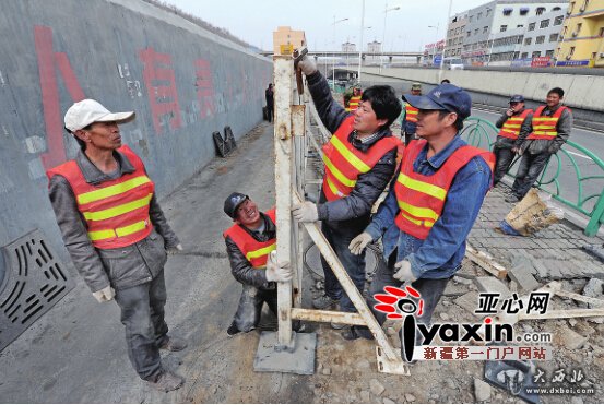 昨日,阿勒泰路机电市场附近,工人们正在搭建施工围挡。阿勒泰路高架一期工程目前已进入施工准备期。亚心网首席记者张万德摄
