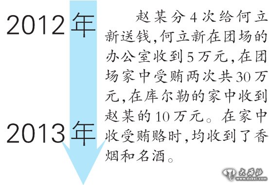 2012年,在库尔勒开榨油坊的赵某结识了何立新。当时,何立新代表该团党委与赵某签订并履行“油饼购销合同”,在业务往来中,赵某给何立新送去人民币45万元及五粮液一箱、红花郎酒一箱、金剑南酒一箱、软中华香烟6条。