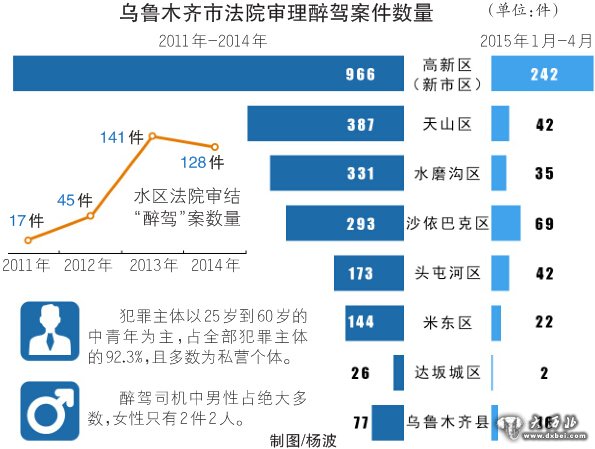 记者从乌市中级人民法院了解到,从2011年5月1日醉驾入刑以来,乌鲁木齐市法院2011年-2014年共审理危险驾驶案件2397件,其中,高新区(新市区)法院966件,天山区法院387件,水区法院331件,沙依巴克区法院293件,头区法院173件,米东区法院144件,乌鲁木齐县法院77件,达坂城区法院26件。