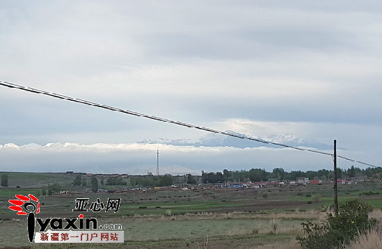 张婉露拍下的照片显示,在一片田地上,接近地平面上方的天空,云层上出现了连绵的雪山山峰。