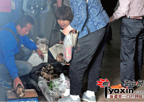 5月26日,乌鲁木齐市北门地下通道,一名男子正在卖野蘑菇,很多市民购买。(偷拍)亚心网记者 史纪伸 实习生 谢鹏 摄