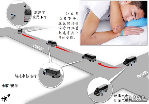 赵建宇说,司机驾车到文化西路到延安北路向右转时,行驶速度太快,他被甩了下来。随后,该面包车占左车道闯红灯逃逸,他在地上翻滚3圈后爬了起来,路人将他扶到路边休息。从他执勤的路口到被甩下车的地方,有近500米距离。