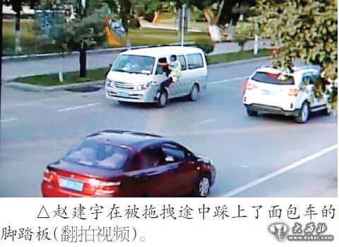 20时17分:09秒,在文化东路广场南侧巷口,赵建宇双脚踩在面包车左前方踏板上,双手紧扒车窗,车速极快;35秒,面包车出现在延安北路西北角处,赵建宇抓着车窗;37秒,挂在车上的赵建宇被甩了出来。整个过程持续1分11秒。