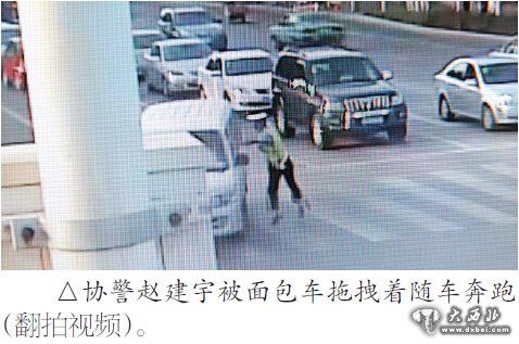 惊慌失措的赵建宇被面包车拖行了一段路后,情急之下双脚踩到了面包车左前侧的踏板上,一只手扒紧扶手和车窗。“师傅,停车,要冷静。”赵建宇边说边使劲想挣脱,但该车司机没有停车,在面包车行驶到文化东路南侧巷口时,赵建宇终于把手挣开,左手紧抓车上扶手,右手抽出随身带的警棍敲击车窗,喊着让司机停车,但司机情绪激动,多次扬言不想活了。