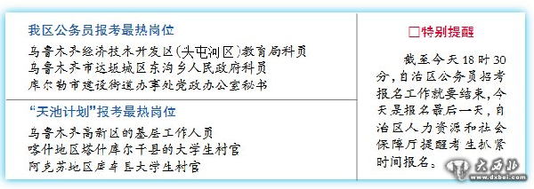大西北网讯 有的职位188人争抢,有的职位无人问津。昨日,新疆人事考试中心公布了新疆公务员招考和“天池计划”招村官的报名情况。从6月13日自治区公务员招考报名工作启动截至17日18时30分,竞争最激烈的是乌鲁木齐经济技术开发区(头屯河区)教育局科员一职,报名188人,只招录1人,但还有836个职位却无人报考。