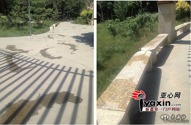 6月25日,克拉玛依西街盛大花园附近小游园,空地和石凳上都被人泼上了机油。亚心网记者吴佩涵摄