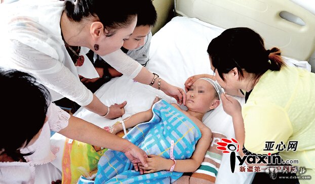 昨天,在新疆医科大学第二附属医院,5岁全喜的右腿骨折,家人都来看望他,他11岁的哥哥还在新疆医科大学第一附属医院重症监护室里治疗。亚心网首席记者张万德摄
