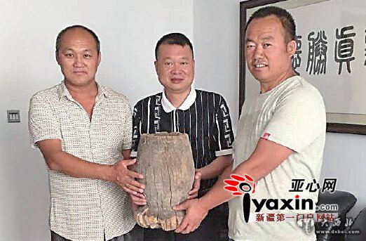 6月22日,工人魏世东、杨成在捡到百年木质捣臼后,立即上交昌吉市文物局,该文物局局长刘怀胜(中)说,木质捣臼属于一般文物,它反映了当时的生产力和生产关系。图/通讯员刘怀胜