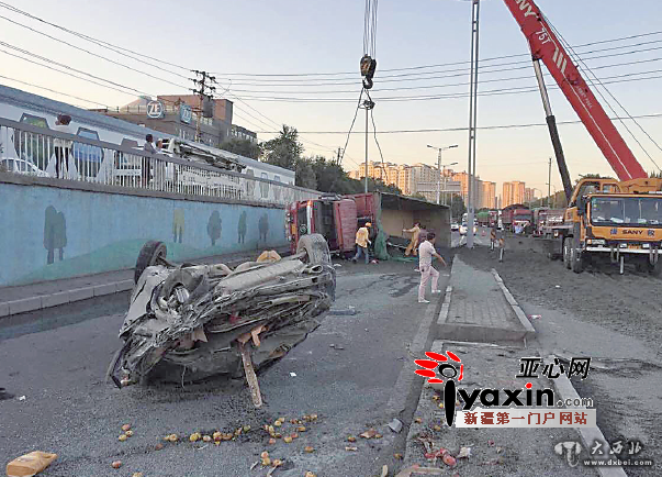 昨日,记者从乌市公安局交警支队城市快速路交警大队了解到,接到报警后民警赶到现场看到,两车相距约七八十米,均从主道翻倒在辅道上,货车所拉沙子撒在河滩路主道及辅道上,而小轿车仰面朝天,受损非常严重。