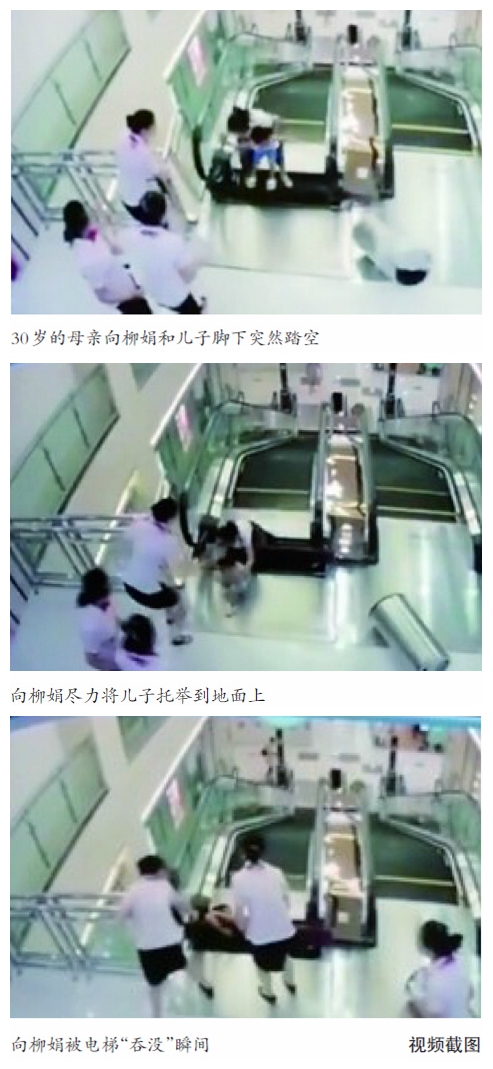 监控视频显示,10时10分5秒左右,一名女子牵着小男孩通过手扶电梯上楼。就在母子两人刚跨过手扶电梯、即将到达电梯顶部时,脚下的电梯盖板突然踩空,母亲瞬间陷了进去。此时,勇敢的妈妈用力托举出儿子。孩子脱离了险境,但母亲在挣扎几秒后却完全被电梯“吸”了进去,整个过程仅用时9秒。
