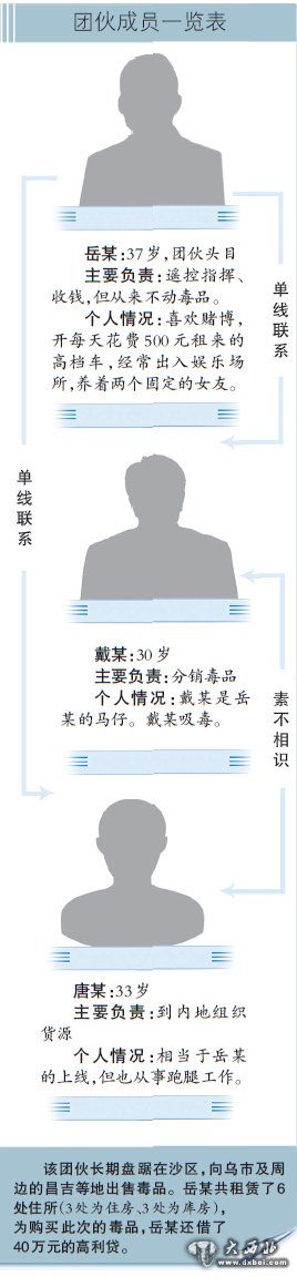 侦查员介绍说,该贩毒团伙成员共有3人,以岳某为首,其主要负责遥控指挥、收钱,但从来不动毒品;戴某是岳某的马仔,主要帮助其分销毒品;唐某主要负责到内地组织货源,相当于岳某的上线,但也从事跑腿工作。