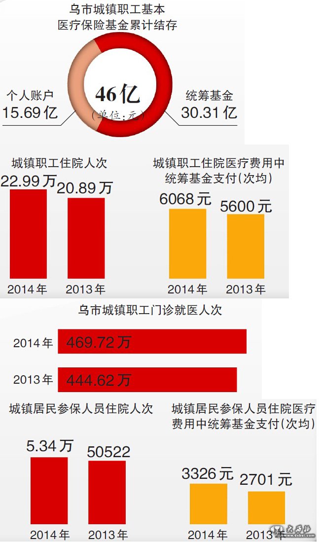 数据显示,在就医与待遇支付方面,2014年乌市城镇职工门诊就医人次为469.72万人次,比上年增加25.1万人次,增长5.65%。城镇职工住院人次为22.99万人次,比上年增加2.1万人次,增长10.05%,住院医疗费用中统筹基金次均支付6068元,较上年增加468元,增长8.36%。2014年城镇居民参保人员住院5.34万人次,比上年增加2878人次,增长5.7%,住院医疗费用中统筹基金次均支付3326元,较上年增加625元,增长23.14%。