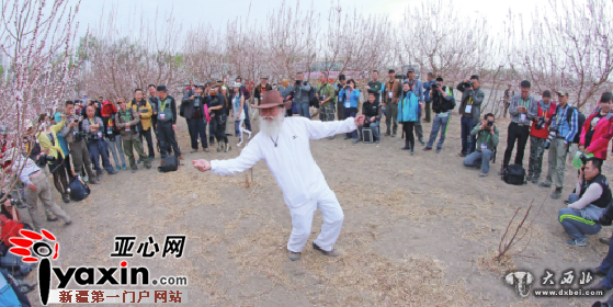 3月28日,游客在托克逊县夏乡南湖村杏园欣赏民俗风情表演。资料图片