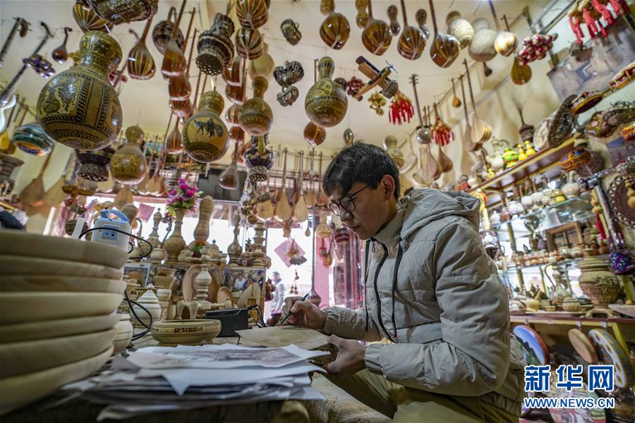 吾买尔江·玉素因在喀什古城景区一家木制手工艺品店里工作(2月16日摄)。 新华社记者 赵戈 摄