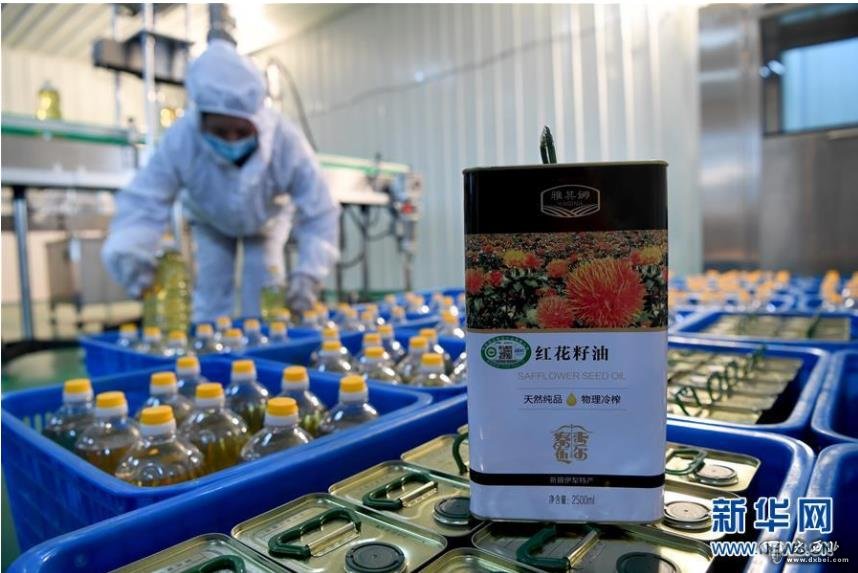 4月7日,新疆察布查尔锡伯自治县红花产业园伊犁雅其娜农业发展有限公司灌装车间的工人在整理已灌装好的红花籽油。近年来,新疆察布查尔锡伯自治县大力发展红花产业,相继引进多家企业发展红花系列产品,目前全县种植红花13万亩左右,红花已成为察布查尔县助农增收的特色产业之一。新华社记者沙达提摄