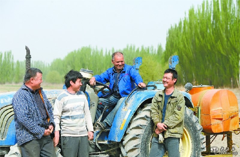 4月11日,库车县齐满镇甬库团结村村民王明银(左一)与买买提·阿皮孜(右二)两家人在春耕生产中互相帮助,劳动间隙话家常。