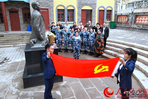 苏丽亚·买提明带领大家面向鲜红党旗庄严重温入党誓词。刘海摄