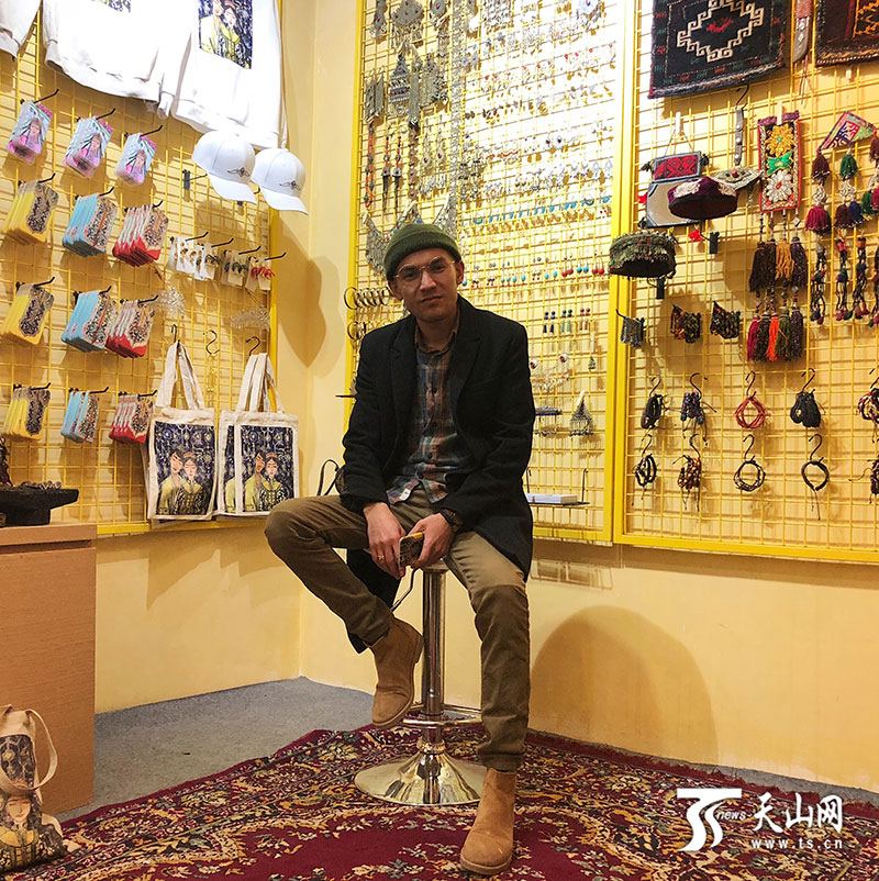 在麦吾兰的小店里,有50多件特色文创产品,特色纹饰的T恤、本子、钱包、布袋,还有各种夸张华丽的饰品,通过线上和线下共同销售,每月他的文创店都有近万元收入。“来喀什旅游三天,我来他店里两次,还收藏了网店,他这里的文创产品很棒。”北京游客徐游说。
