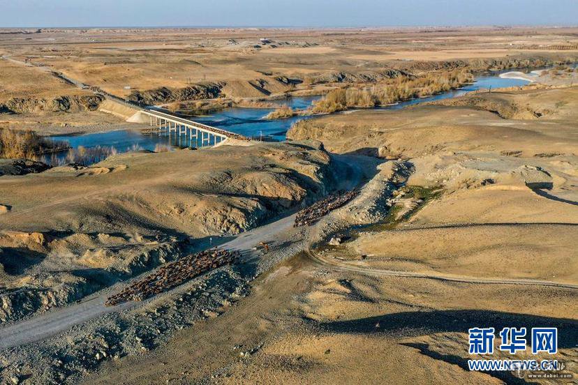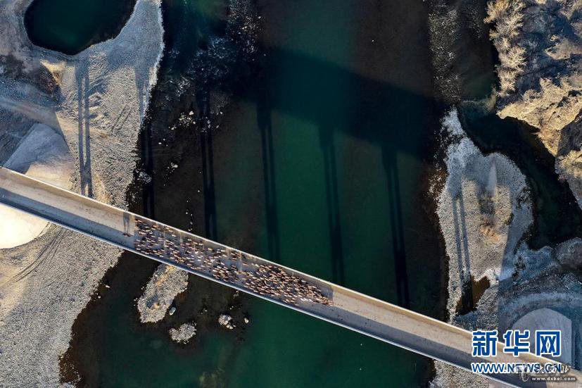 4月17日,新疆福海县牧民赶着牲畜穿过位于额尔齐斯河上的萨尔布拉克大桥,向春秋牧场进发(无人机照片)。新华社记者 马锴 摄