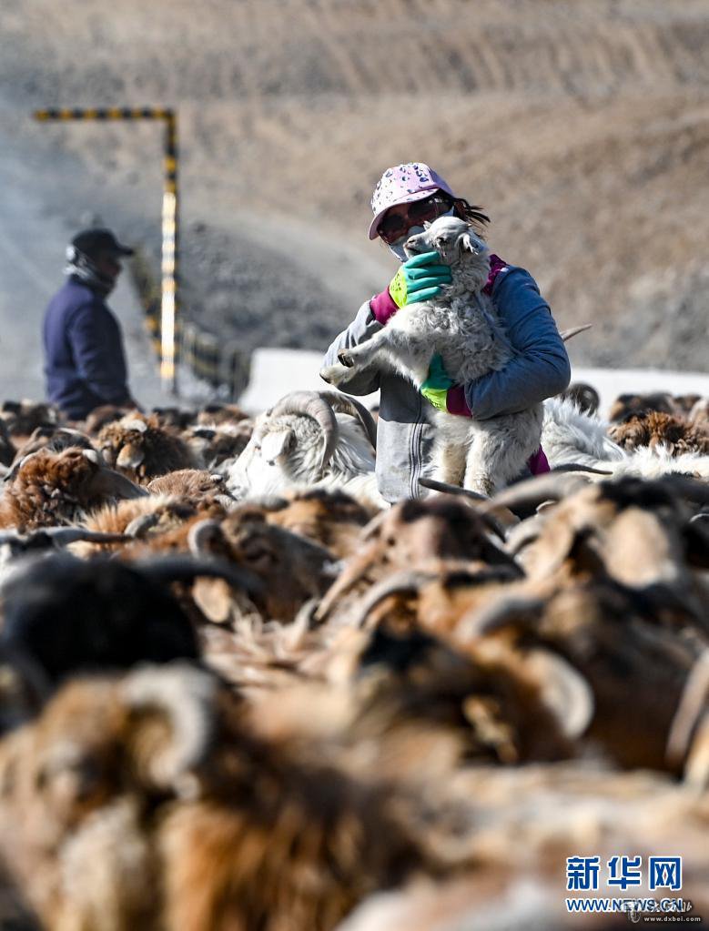 4月17日,新疆福海县牧民在转场途中查看羊羔的身体状况。新华社记者 马锴 摄